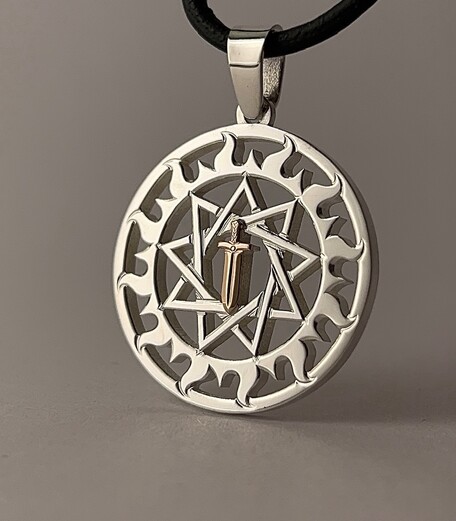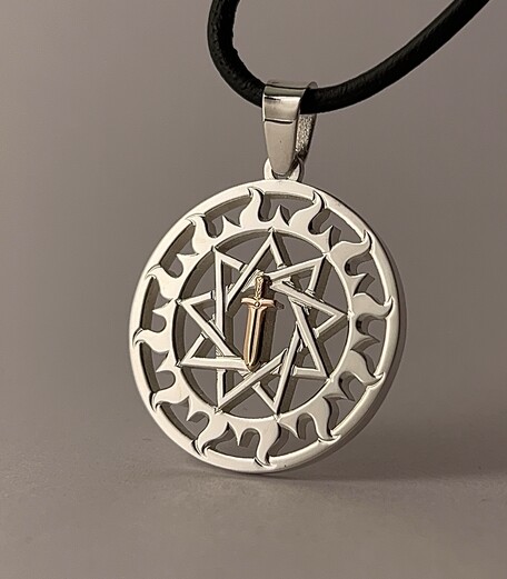 Оберег воина сделанный из серебра и золота. Это мужской кулон, меч в девятиконечной звезде Инглии. Которая символизирует гармонию стихий и состоит из трёх треугольников.